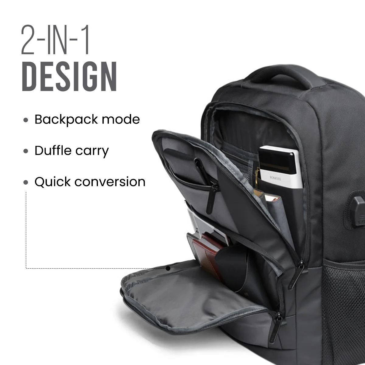 The multi-layer partition design can accommodate 15.6-inch laptop, tablet, A4 size books, wallet, mobile phone, clothes, etc. With external USB port, you can easily and conveniently charge mobile phone, tablet, and other devices without opening the bag